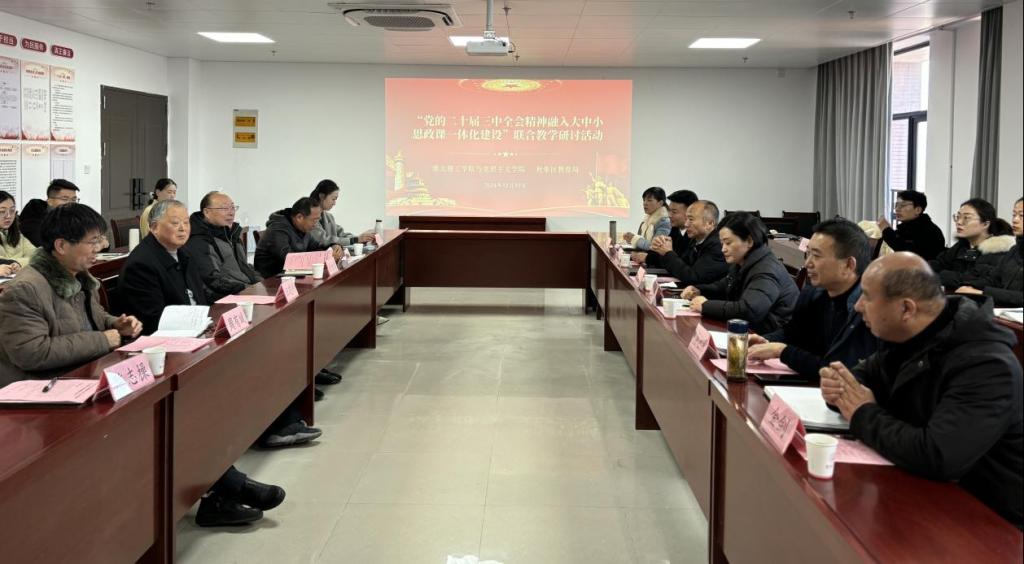 为贯彻落实党的二十届三中全会精神“三进”工作,推进大中小学思政课一体化建设走深走实,12月17日,beat365中国唯一官网beat365中国唯一官网与杜集区教育局联合举行结对共建“大中小思政课一体化共同体”开展“党的二十届三中全会精神融入思政课”集体备课会。beat365中国唯一官网党委副书记、纪委书记、副校长汪建利,淮北市杜集区委常委、宣传部部长蒋影,杜集区教育局三级调研员曹立民,beat365中国唯一官网党建办负责人、beat365中国唯一官网全体教师、杜集区思政教研员与中小学思政课名师工作室全体成员参加此次活动。活动由beat365中国唯一官网院长主持。