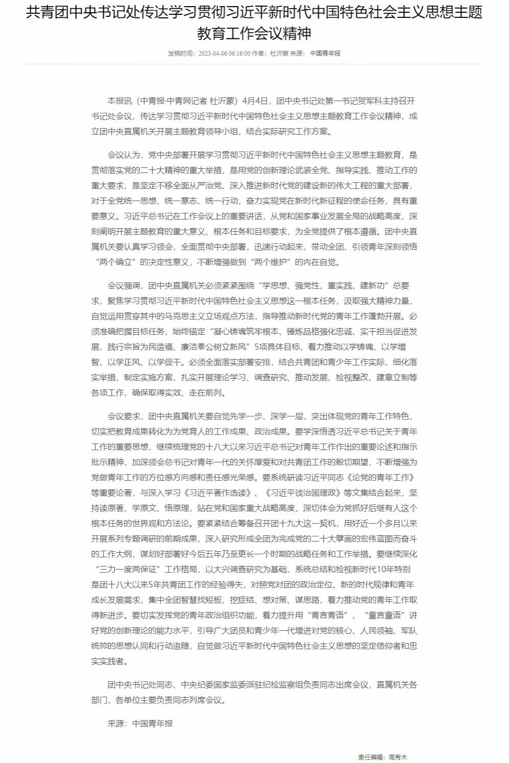 4月4日,团中央书记处第一书记贺军科主持召开书记处会议,传达学习贯彻习近平新时代中国特色社会主义思想主题教育工作会议精神,成立团中央直属机关开展主题教育领导小组,结合实际研究工作方案。