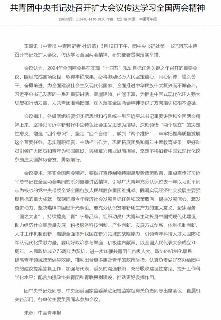 共青团中央书记处召开扩大会议传达学习全国两会精神
