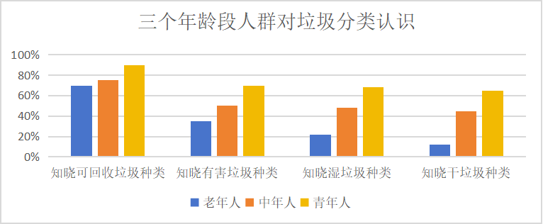 此次调研了解到当地共有4个垃圾处理站、6个垃圾分类回收站;对村内不用年龄阶层人员进行调研得到数据如下。可见无论哪个年龄段的人,对可回收垃圾的知晓程度远大于干、湿垃圾分类,就年龄段来说,青年人对垃圾分类的了解大大超过老年人。