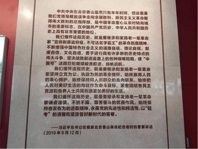 “中共中央在北京香山虽然只有半年时间,但这里是我们党领导解放战争走向全国胜利、新民主主义革命取得伟大胜利的总指挥部,是中国革命重心从农村转向城市的重要标志,在中国共产党历史、中华人民共和国历史上具有非常重要的地位。”