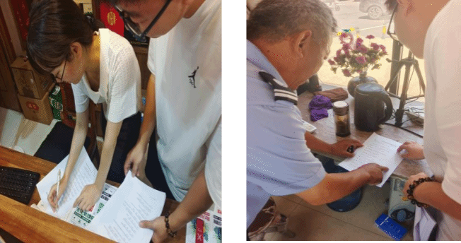 村民接受调查并填写问卷调查