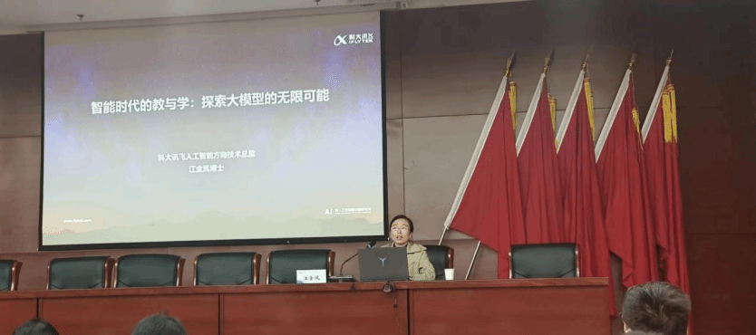 当天早上八点,同学们衣着整齐在工作人员的指导下准时到达报告厅并排坐好,安静等待此次活动开始。十五分钟后,在工作人员的带领下,此次活动的应邀教授、学者依次出席入座。本次讲座邀请了我国人工智能领域的各权威专家和科大讯飞应用技术专家江金凤博士,共同探讨智能时代教与学的变革趋势,以及大模型如何在这个过程中发挥关键作用。讲座内容涵盖了人工智能技术的发展、大模型技术的应用、教育教学的变革等方面。