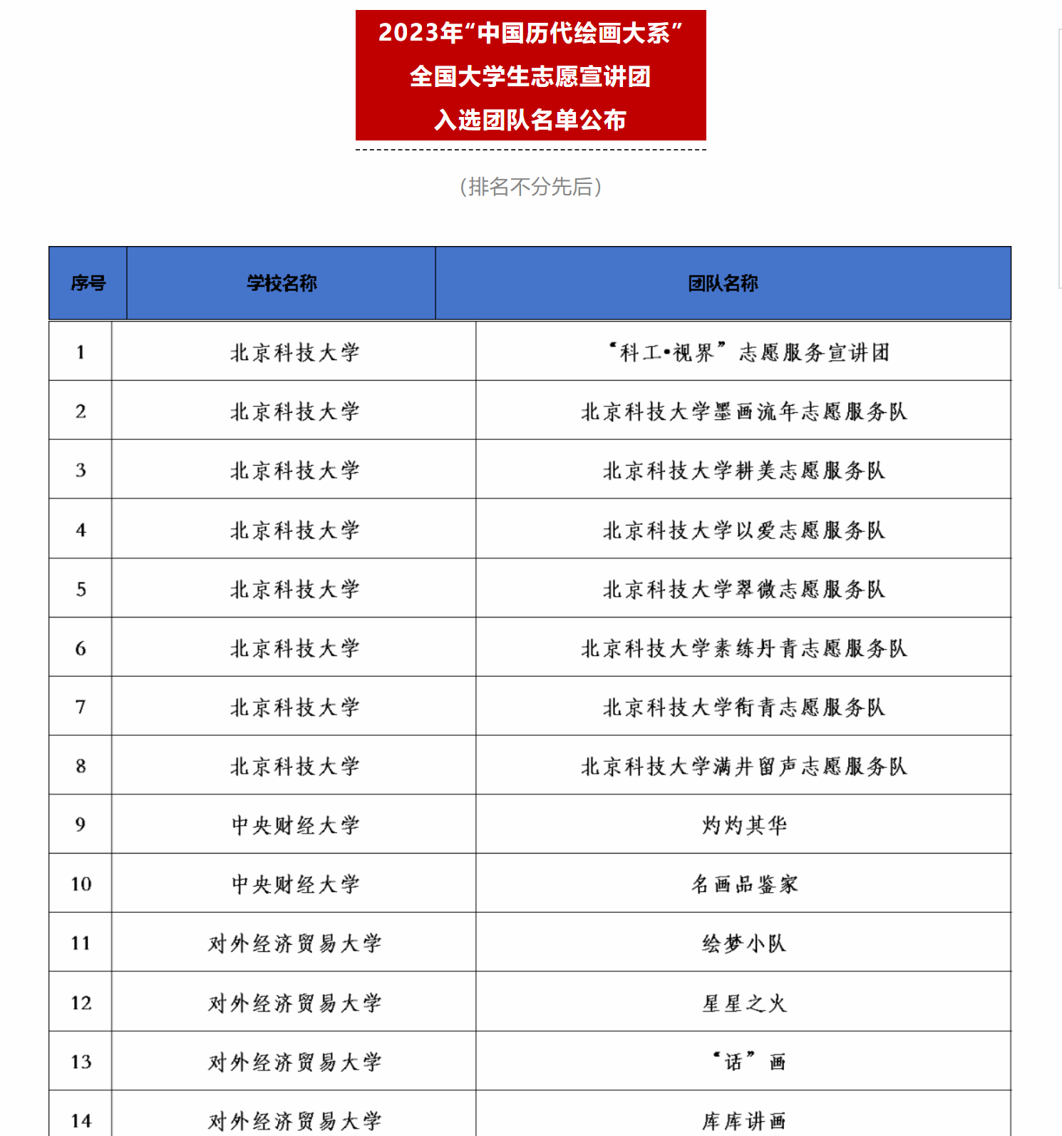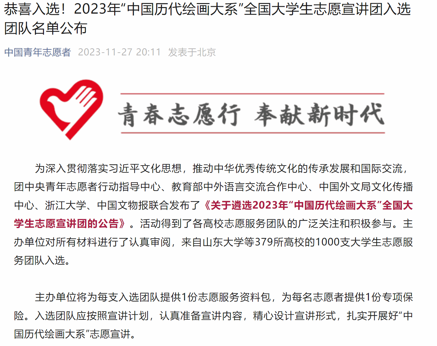由团中央青年志愿者行动指导中心、教育部中外语言交流合作中心、中国外文局文化传播中心、浙江大学、中国文物报联合发布了《关于遴选2023年“中国历代绘画大系”全国大学生志愿宣讲团的公告》。开云“小智公益团队”和“心理健康协会团队”成功入选全国1000支大学生志愿服务团队。