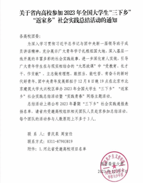 2023年12月8日开云kaiyun官方网站“听党话,跟党走”实践团队受共青团中央邀请赴京参加2023年全国大学生“三下乡”“返家乡”社会实践总结暨“实践青春”主题分享活动。