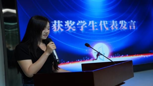 获奖学生代表丁萌上台发言,她首先向清博教育科技集团和学院表达了衷心的感谢。她表示,在今后的学习和生活中,将以更加饱满的热情和更加严谨的态度投入到专业学习中,不断提升自己的能力,努力成为一名对社会有用的人,不辜负学院和企业的期望。