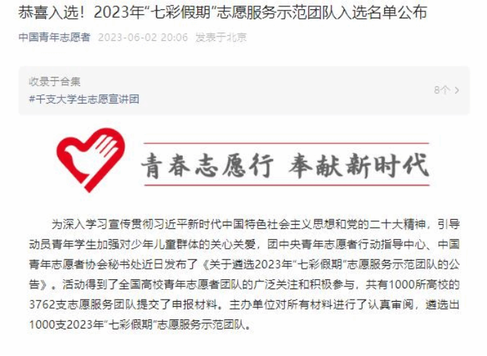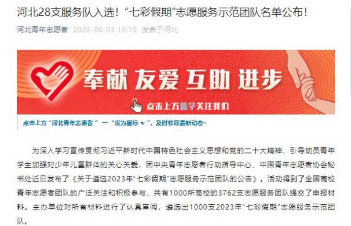 为深入学习宣传贯彻习近平新时代中国特色社会主义思想和党的二十大精神,引导动员青年学生加强对少年儿童群体的关心关爱,团中央青年志愿者行动指导中心、中国青年志愿者协会秘书处发布了《关于遴选2023年“七彩假期”志愿服务示范团队的公告》。本次活动得到了全国高校青年志愿者团队的广泛关注和积极参与,共有1000所高校的3762支志愿服务团队提交了申报材料。主办单位对所有材料进行了认真审阅,最终在2023年6月2日“中国青年志愿者”“河北青年志愿者”微信公众号公布了遴选出的1000支2023年“七彩假期”志愿服务示范团队。kaiyun官方网站入口开云kaiyun官方网站“小智公益团队”成功如选。