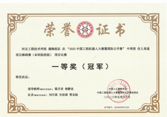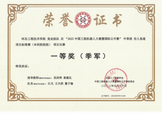开云kaiyun官方网站组织师生报名参加,经过现场激烈角逐,三个参赛项目均荣获国家级奖励,其中,在仿人竞速项目障碍赛中,由梁月肖老师和杨静宜老师指导的避障组(刘天雨、关佳雨、贾名扬)荣获一等奖(冠军),在仿人竞速项目标准赛中,由吴洪伟老师和崔建弘老师指导的竞走组(江凡、王天然、董子瑜)荣获一等奖(季军),在仿生爬坡项目双足仿人赛中,由王乐老师和崔志老师指导的蜗牛组(江凡、刘天雨、贾名扬)荣获二等奖。