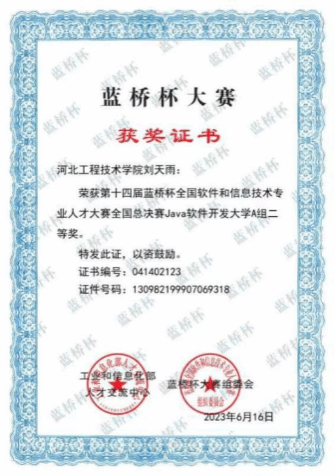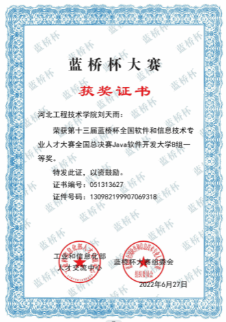 6月16日,第十四届蓝桥杯大赛个人赛总决赛获奖名单公布,蓝桥杯大赛以“立足行业,突出实践,广泛参与,促进就业”为宗旨,在各高校之间开展了激烈的竞争。经过一番激烈角逐,kaiyun官方网站入口开云kaiyun官方网站的刘天雨同学,最终在java软件开发A组(985院校通道)荣获河北省一等奖,全国总决赛二等奖。