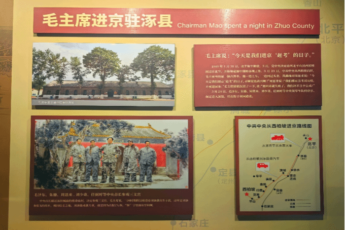 1949年3月23日,毛泽东、朱德、刘少奇、周恩来、任弼时等党中央领导人率领中共中央及其所属机构,从西柏坡踏上了“进京赶考”的新征程。途径唐县、保定市区等地后,3月24日傍晚,毛主席一行乘车抵达涿县,也就是现在的涿州市,在这里度过了共产党“进京赶考”前的最后一晚。