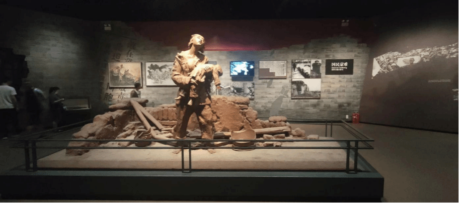 红盾利刃调研队在纪念馆外“誓死不当亡国奴”标语前合影留念