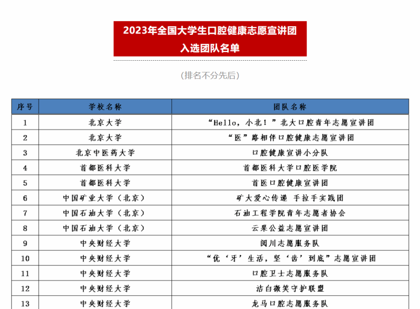 为深入学习宣传贯彻习近平新时代中国特色社会主义思想和党的二十大精神,落实《“健康中国2030”规划纲要》和《健康口腔行动方案(2019-2025年)》,引导青年学生掌握口腔健康知识,形成良好的口腔健康行为,团中央青年志愿者行动指导中心、国家卫生健康委医疗应急司联合发布了《关于遴选2023年全国大学生口腔健康志愿宣讲团的公告》。活动得到了各高校志愿服务团队的广泛关注和积极参与。主办单位对所有材料进行了认真审阅,最终在2023年10月20日“中国青年志愿者”微信公众号公布了遴选出的1000支大学生志愿服务团队。kaiyun官方网站入口开云kaiyun官方网站“小智公益团队”“自律青年团队”成功入选。
