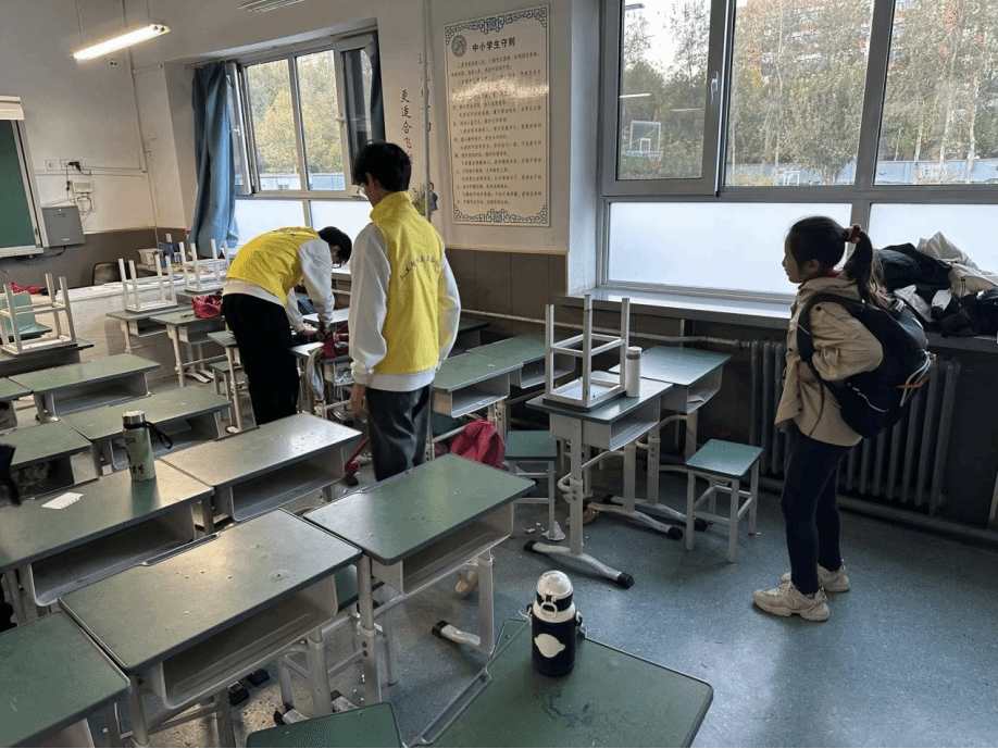 放学后,志愿者帮助孩子们收拾书包,整理教室