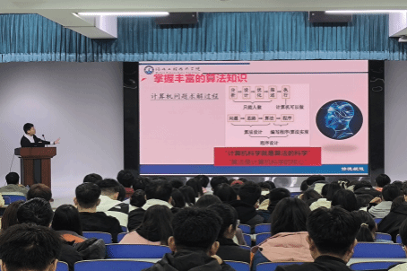 讲座开始,王乐老师讲解了近年来学生们参与的竞赛以及学生获奖的情况,主要介绍了ICPC、蓝桥杯等知名赛事,并十分细致的向学生们详述了蓝桥杯比赛的赛制和评分机制。王老师鼓励学生们要学好高数和英语,为学习算法打好坚实的基础。王老师的讲解形象生动,语言简练易懂,将复杂的知识点以易于理解的方式呈现给学生们,讲解深入浅出,使学生们在轻松愉快的氛围中汲取新知识。