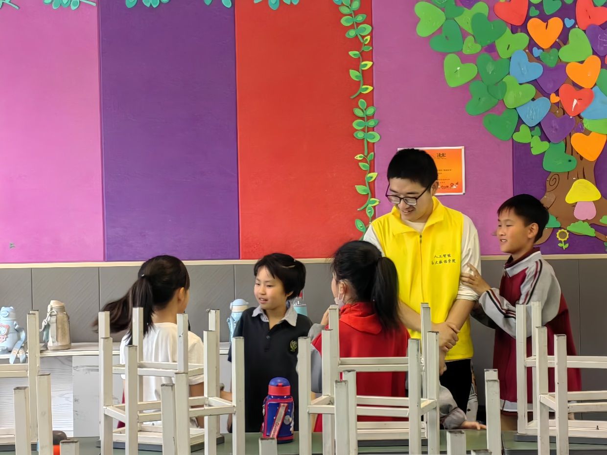 志愿者们不仅帮助孩子们解决作业中的难题,还通过一对一的辅导,提高了他们的学习兴趣和自信心。在维持课堂秩序方面,大学生们展现出了极高的责任心和耐心,他们用严谨的态度和亲和力赢得了孩子们的尊重和喜爱。在活动结束之时,志愿者协助学生们一起打扫教室卫生并在活动结束后有序组织学生们安全离开校园。