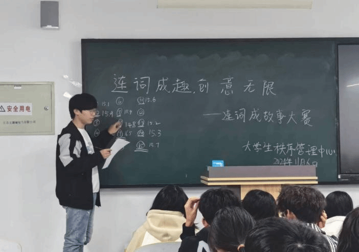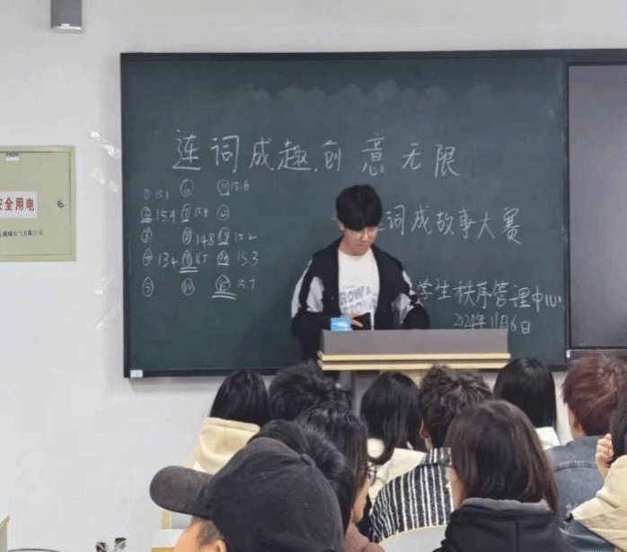 开云kaiyun官方网站大学生秩序管理中心于2024年11月6日于主教1-1举办了“连词成趣,创意无限——连词成故事大赛”活动。