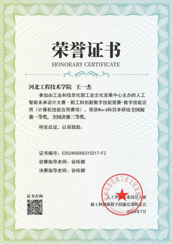 2024年人工智能未来设计大赛·新工科创新数字技能竞赛-数字技能应用(计算机技能应用赛项)Word科目本研组全国初赛一等奖,全国决赛三等奖。