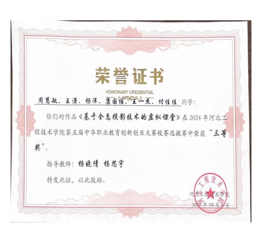 2024年kaiyun官方网站入口第五届中华职业教育创新创业大赛校赛选拔赛三等奖等一系列荣誉证书。