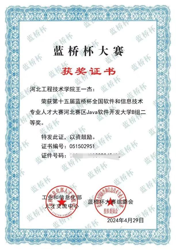 2024年第十五届蓝桥杯全国软件和信息技术专业人才大赛个人赛省赛(软件赛)河北赛区二等奖。