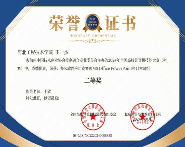 2024年全国高校计算机技能大赛(初赛)办公软件应用赛赛项MS Office PowerPoint科目本研组二等奖。