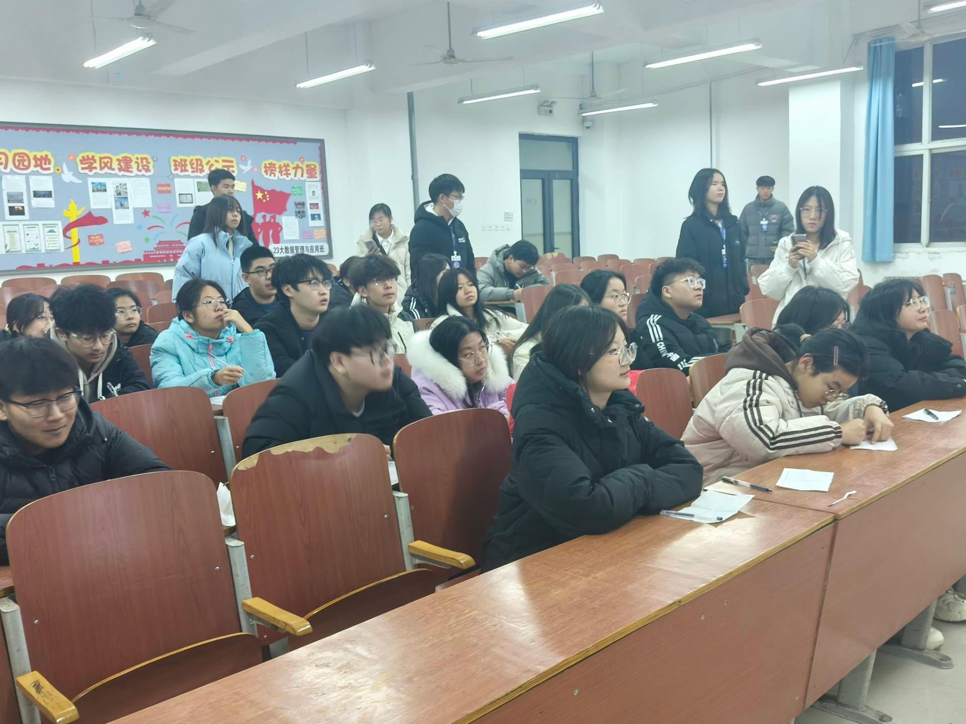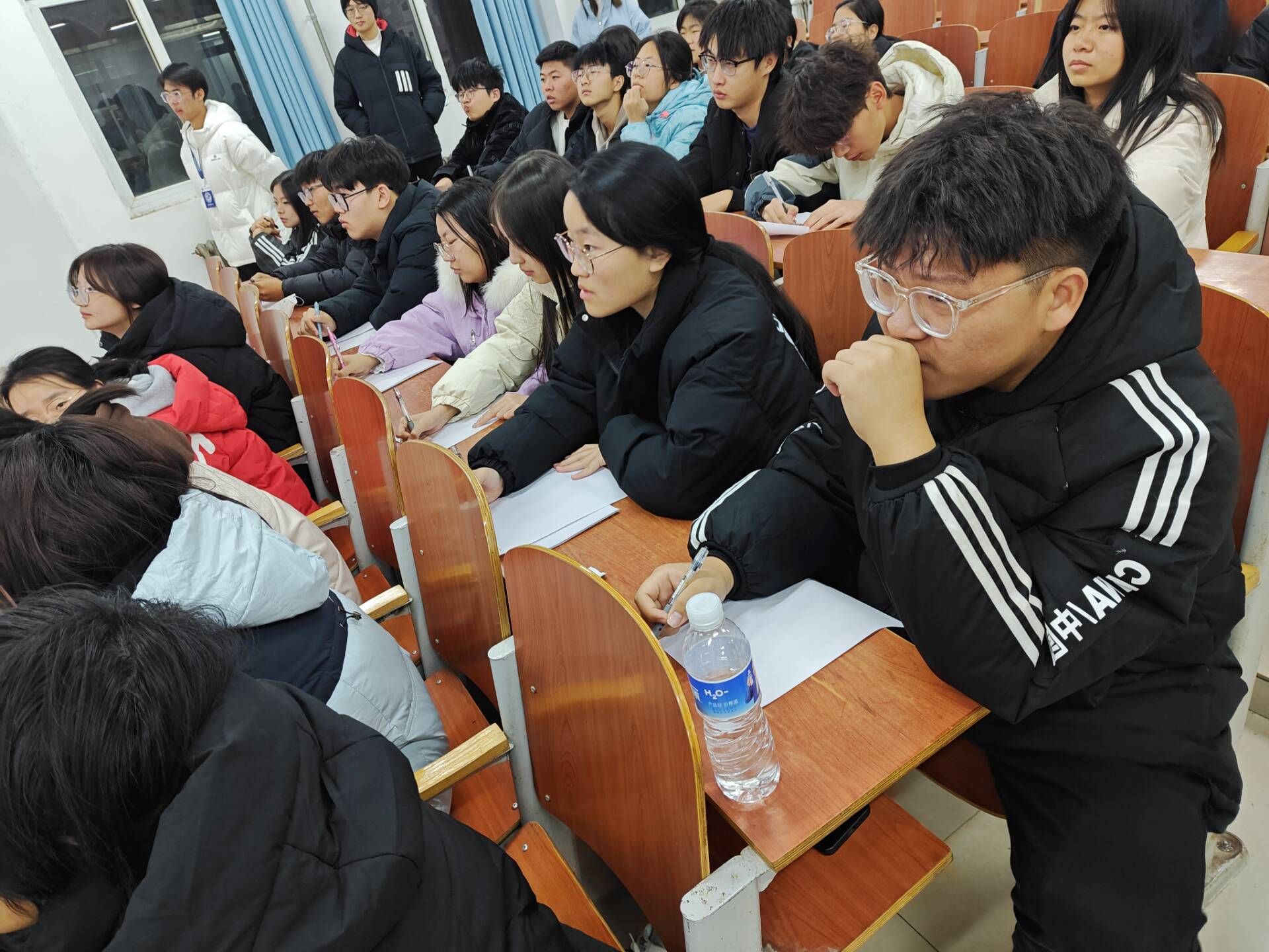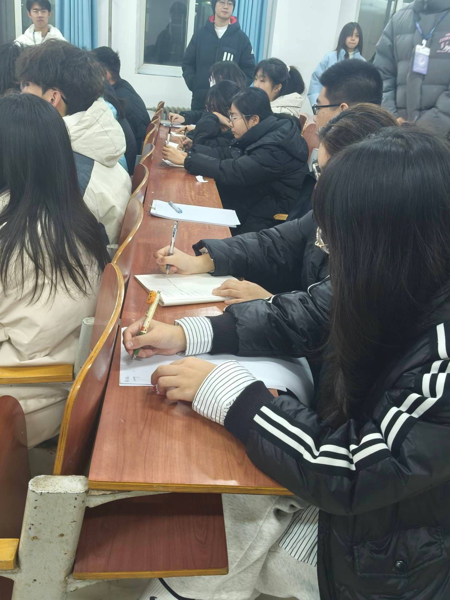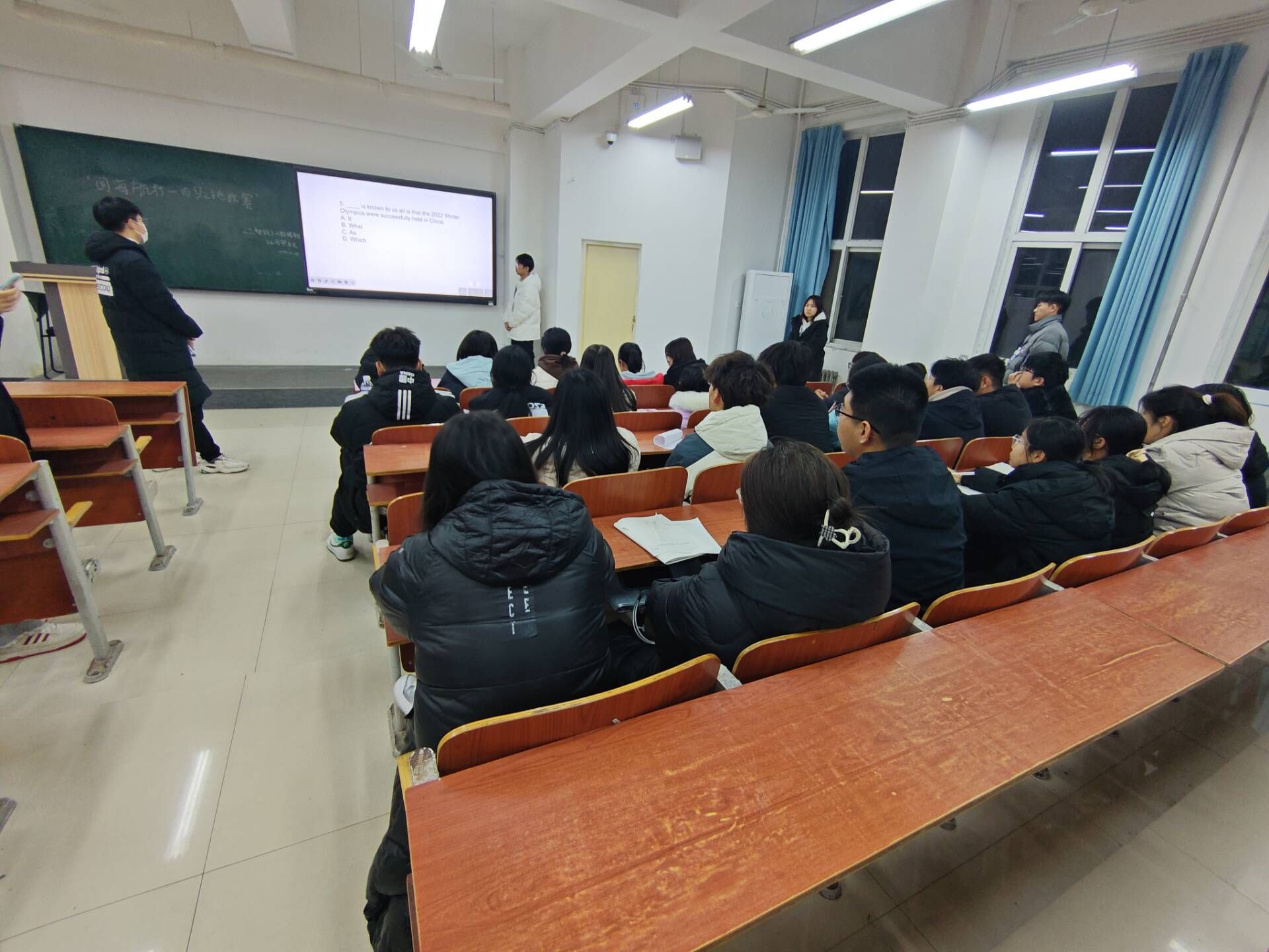 活动过程中,由工作人员播放幻灯片,参与人员根据幻灯片上的英语题目进行答题。题目内容为英语四级的热门词汇,以选择题、填空题等多种形式考察。学生们的答题氛围热烈,认真读题,仔细答题,争分夺秒,沉着应答,彰显着学生的精神素养。