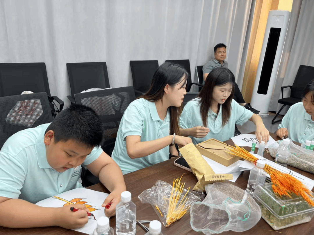 在实践活动的尾声,团队成员体验了富有创意的“麦粒创意拼贴”活动。队员们亲手从麦穗上取下颗粒,感受其饱满的质地与自然的色泽。通过精心排列与粘贴,平凡的麦粒逐渐化作生动的图案。这不仅锻炼了他们的动手能力和艺术审美,更让他们在专注与耐心之中,深刻体会到“粒粒皆辛苦”的内涵,感受到每一颗粮食背后凝结的劳动价值,并认识到即使是寻常的农作物,也能通过创意焕发出新的生命力与美感。