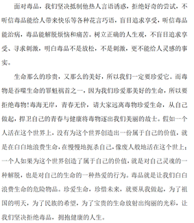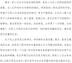 学生能通过此次征文活动,能积极主动收集材料,学习毒品相关知识,提升毒品辨别能力与预防意识,认识到毒品对社会和家庭的危害,了解我国禁毒工作现状,进一步增强学生的禁毒意识,参与到禁毒大军中。同样的,美丽的人生中,当然会有种种诱惑,美丽的诱惑,致命的诱惑,我们应适度抑制自己的好奇,永远不要去接触他们。