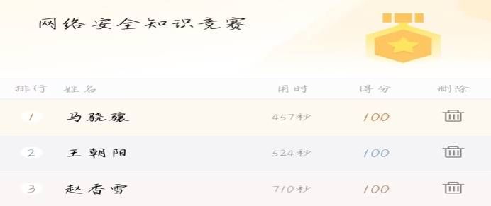这次的网络安全竞赛的成绩单,主要是根据参与活动的学生的用时以及答题质量进行排名次,工作人员根据学生的成绩分出一等奖,二等奖,三等奖以及优秀奖,最后根据成绩为参与的学生发放学分。