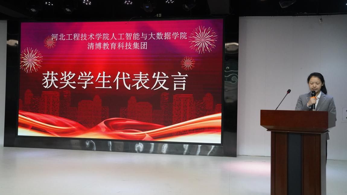 在众多领导和嘉宾的见证下,奖学金和奖品依次颁发给了优秀学生奖、三等奖、二等奖和一等奖的获得者。获奖学生纷纷对清博授予的奖学金和奖品表示感谢。随后,获奖学生代表21级虚拟2班冯艺婷同学也上台分享了她的获奖感受。代表获奖学生对清博设立奖学金表达了由衷的感谢,并表示会以奋发有为的精神面貌,以新的姿态迎接新的挑战,更努力,更拼搏,学习更进步!当获奖学生代表冯艺婷同学站在台上,分享她的获奖感受时,我们看到了一个青春的背影,一个充满激情与梦想的年轻人。她用她的坚持、努力和团结互助诠释了梦想的力量。