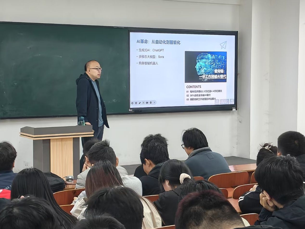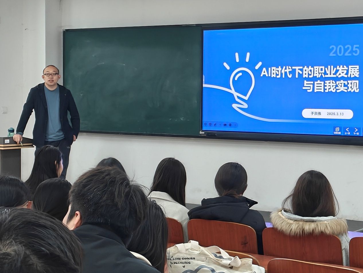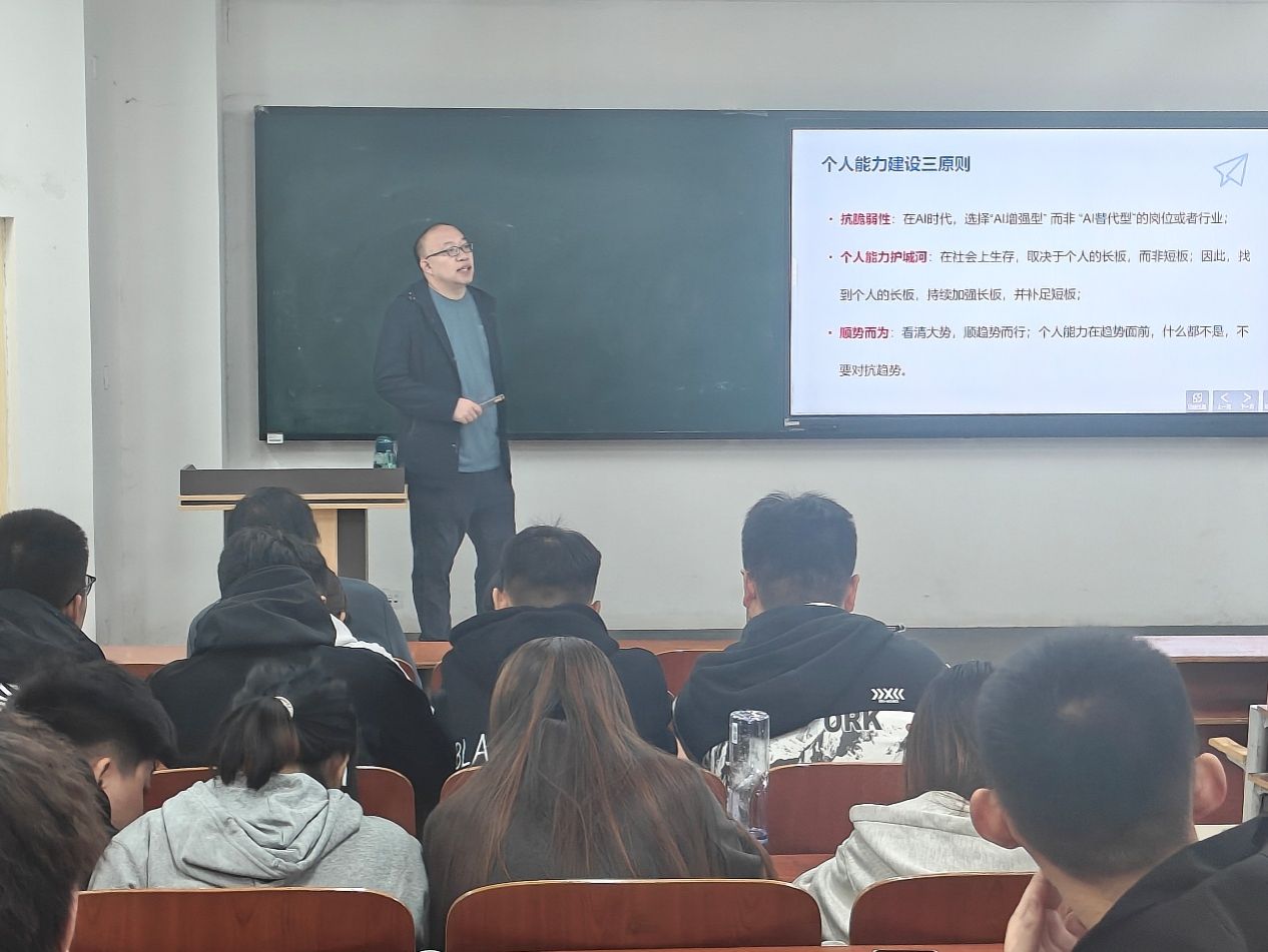 接着,于教授重点讲解了如何培养适应AI时代的核心技能,包括数据分析、编程能力、创新思维等,这些技能将成为未来职场中不可或缺的竞争力。他鼓励全体学生不仅要关注技术的表面应用,更要深入理解其背后的原理和逻辑,以便更好地驾驭技术,而不是被技术所驾驭。于洪伟教授还探讨了在AI技术快速发展的背景下,如何保持个人价值观的独特性,实现自我价值的最大化,让每位学生都能在AI时代中找到属于自己的舞台。