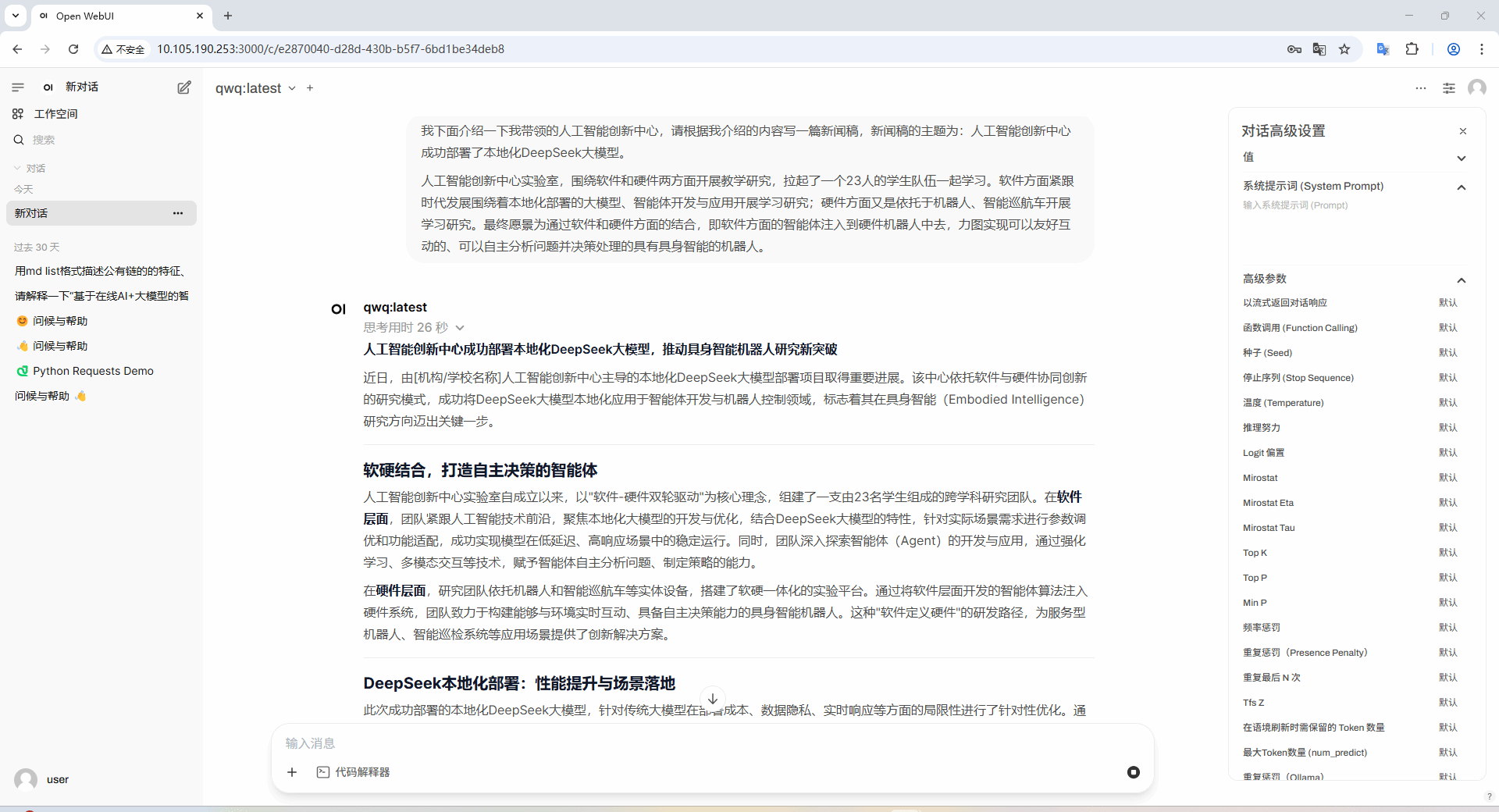 此次成功部署的本地化DeepSeek大模型,针对传统大模型在部署成本、实时响应等方面的局限性进行了针对性优化。通过模型轻量化压缩、边缘计算适配等技术手段,团队显著降低了模型运行对算力资源的依赖,同时保障了推理速度与精度的平衡。目前,该模型已在以下场景中得到验证: